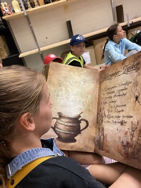 Dann kam Sorah nach vorne – sie war die Schrittezählerin. Wir sollten raten, wie viele Schritte wir gemacht haben. Danach durften wir eine Schatztruhe öffnen und uns einen Schatz rausnehmen. Wir haben einen Zeichenblock bekommen.